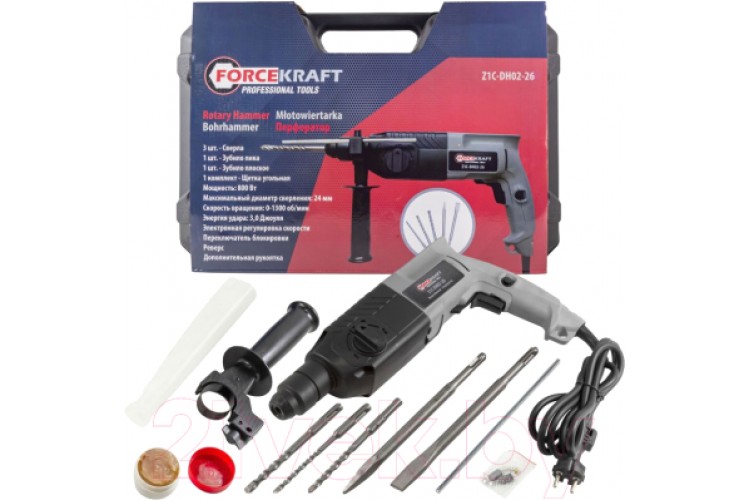 ForceKraft FK-Z1C-DH02-26 — это универсальный и надежный инструмент мощностью 800 Вт, предназначенный для проведения строительных и ремонтных работ дома или в мастерской. Благодаря трем режимам работы и энергии удара в 2.8 Дж, он легко справляется с бурением бетона, сверлением металла и долблением кирпичных или бетонных конструкций.