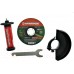 В комплекте зажимная гайка, защитный кожух, опорный фланец, ключ, отрезной диск, комплект щеток угольных, карандаш