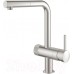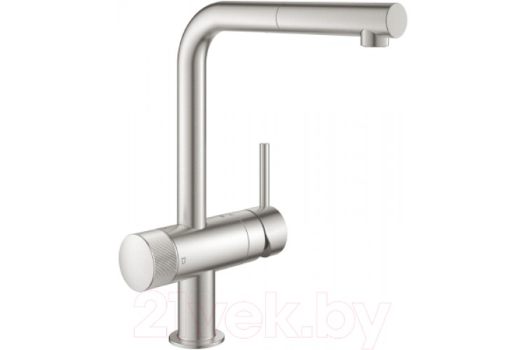 Монтаж на одно отверстие. L-образный излив. Выдвижной излив с аэратором. Отдельная рукоятка для фильтрованной воды — керамический вентиль 1/2". GROHE StarLight. GROHE SilkMove керамический картридж Ø 46 мм. Поворотный трубкообразный излив — диапазон поворота 90°. Отдельные водотоки для питьевой и водопроводной воды. Гибкая подводка.