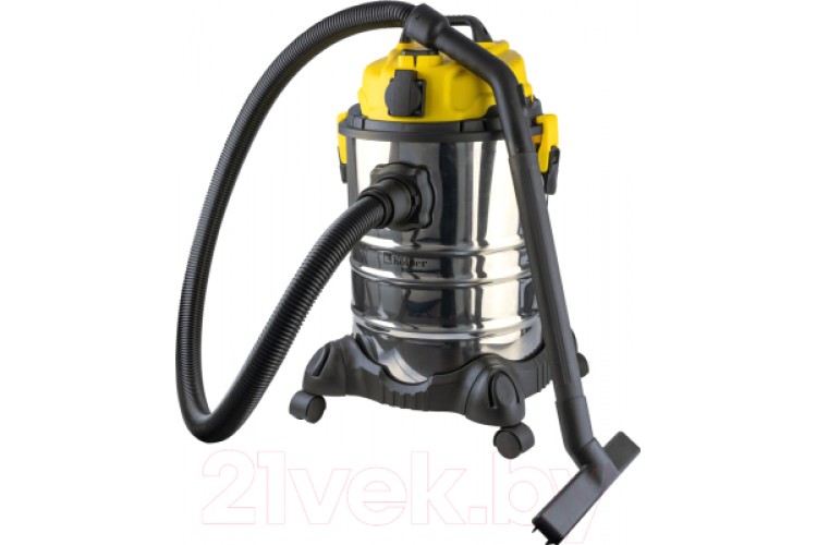 Комплектация: шланг гофрированный 1,5 м, труба трехсекционная, насадка для пола, щелевая насадка, НЕРА-фильтр, пылесборный мешок, рукоятка, колесо - 4 шт.